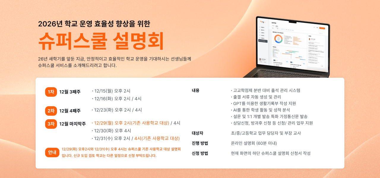 슈퍼스쿨은 국가 성취기준 기반의 교사 수업 지원과정밀한 학생 데이터 분석을 통해 AI가 설계한 맞춤 성장 로드맵으로학생 주도적 성장을 실현합니다.